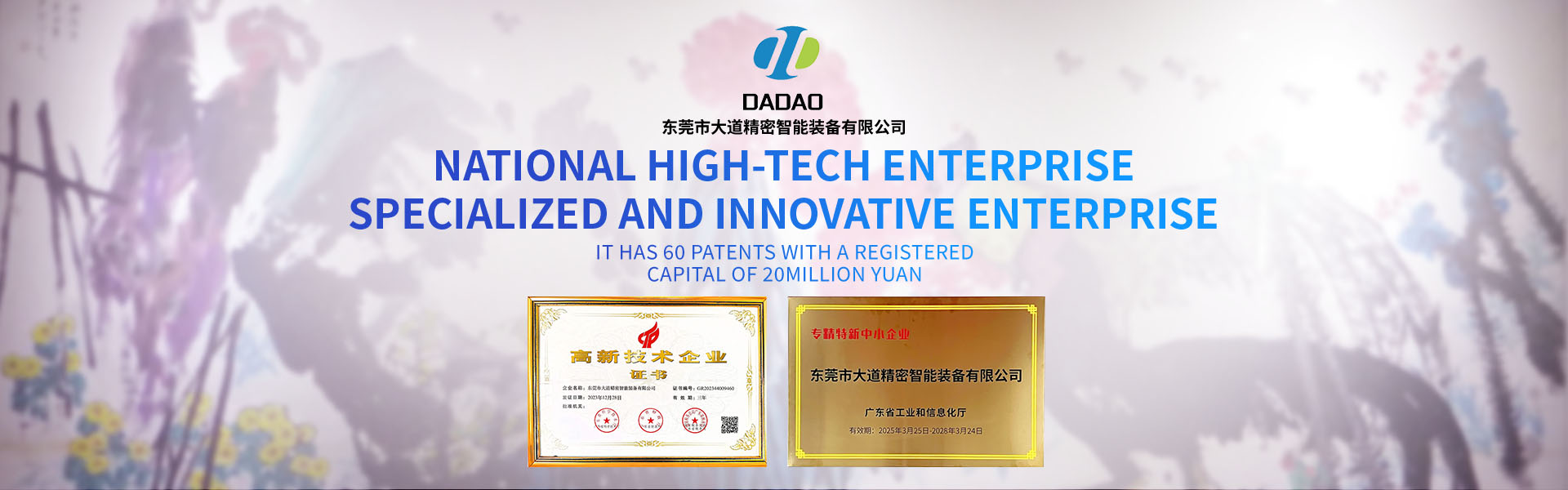 大道精密成立于2019年,公司注冊資本1000萬元,擁有辦公室、廠房等18,000多平方米。已通過ISO9001:2015國際質量管理體系認證,擁有國家各類專利共計58項,獲得“中國大道.商標”和“一帶一路十周年 .國禮品牌”等榮譽稱號,屬于國家高新技術企業,專精特新中小企業。2023年4月成立了“東莞市大道精密智能裝備有限公司關心下一代工作委員會”,是東莞市企石鎮工商聯副會長單位、東莞市企石鎮文學藝術界聯合會副主席單位、東莞市環保包裝行業協會副會長單位、東莞市數控裝備行業協會第二屆會長單位、廣東省包裝技術協會常務理事單位、廣東省膠粘劑行業協會理事單位、國家標準《機械安全中安全防護授權系統的基本要求》起草單位。